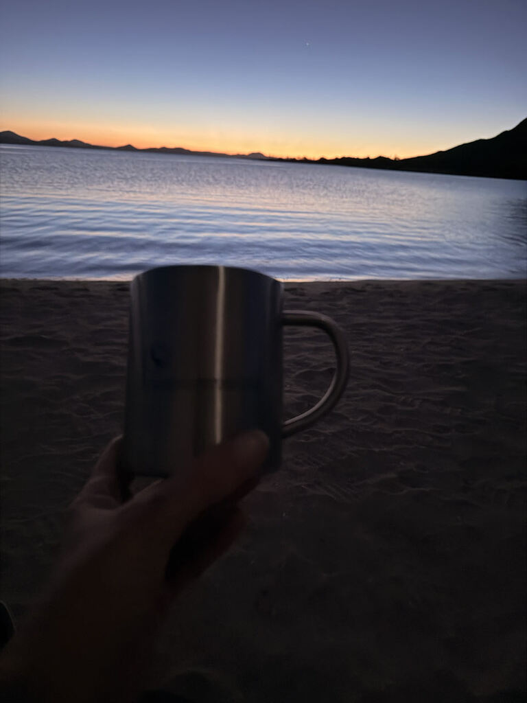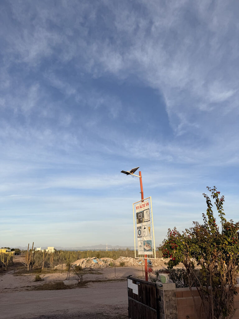 aber unverhofft kommt oft😅 Erst hab ich Abschied genommen, von „meinem“ Strand. Ganz bewusst den Sonnenaufgang genossen, wer weiß, wann wir wieder so einen Traumstellplatz bekommen.., Mit Zoco seine Morgenrunde gegangen, diesmal mit Leine. Frei laufen darf er nur, wenn wir nicht bald fahren. Denn nichts ist Ă€rgerlicher, als abfahren zu wollen und auf den jagenden Hund zu warten 😅 Danach alles zusammen gepackt, das SUB hatten wir schon am Vorabend gepackt, aber nicht aufs Dach befördert, war einfach zu windig. So muss es heute drinnen transportiert werden. Um halb neun ging’s los. Nicht bevor wir uns bei den lieben Nachbarn verabschiedet haben. Schlechte Straßen, aber eine traumhafte Kulisse erwartet uns bei der Fahrt. Wir hatten uns als Ziel einen Campground kurz vor Ciudad Insurgentes ausgesucht. Kurz vor dem Ziel jedoch festgestellt, es ist verdammt frĂŒh. Was sollen wir hier im Inland? Also kurzentschlossen weiter, Richtung La Paz. Auch dort hatten wir im Vorfeld einen Campground ausgesucht, mit heißer Dusche, Pool, Waschmaschine und allem was das das Herz begehrt. Abgebogen von der Mex 1, also der geteerten Straße, in eine Siedlung, die uns schwer beeindruckt. TraumhĂ€user, soweit das Auge reicht. Konnte man von der Straße leider nicht behaupten