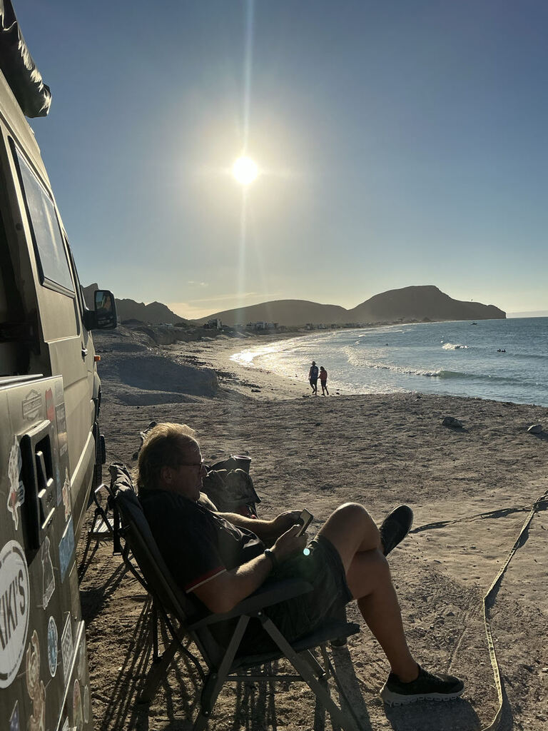 Baja…was bist du schön 🥰 Heute morgen haben wir gemütlich alles eingepackt, Thomas hat nochmals unser Relais gecheckt, hat sich über Nacht leider nicht erholt. Heißt, wir können u.a. unsere Pumpe nicht anstellen und somit kommt kein Wasser. Mist, aber mein kleiner Held hat natürlich eine Lösung parat, überbrückt es erstmal, damit ich abwaschen kann und später sind wir noch in den Baumarkt gefahren und haben fürs erste, einen Schalter gekauft, den Thomas dazwischen geklemmt hat. So kommen wir erstmal klar, bis ein neues Relais kommt. Zum Abschied kam noch An vorbei, für ihren schönen Platz wollte sie nichts haben, ist ja nix vorhanden hier, meinte sie. Na ja, wir sehen uns Montag ja wieder, dann bringen wir halt einen großen Sack Hundefutter mit, für all ihre Hunde. Wir wollen bis dahin noch einmal am Meer stehen, aber vorab in der Stadt noch tanken, nach dem Baumarkt, dann Geld abheben, damit wir ausreichend für die Reparatur ausgestattet sind, denn diese startet wirklich am Montag und wir freuen uns wirklich riesig. Patrick hat abends nochmal all unsere Wünsche aufgenommen und sieht nach wie vor kein Problem. Wir sind total gespannt, haben aber großes Vertrauen, denn er ist seit Jahren Weltreisender und hat in allen möglichen Ländern, seine Reisekasse mit Werkstattarbeiten aufgebessert. Eigentlich hauptsächlich Motorräder, da er selbst, übrigens mit An, die Welt per Motorrad bereist hat. Ein wirklich cooler Typ und ich bin überzeugt, selbst wenn er an seine Grenzen kommen sollte, wird er für uns andere Lösungen finden, schon weil er die hiesige Sprache spricht und einfach gut vernetzt ist. Jetzt genießen wir aber erstmal wieder unser Strandleben. Mal gucken, vielleicht gehe ich morgen mal schnorcheln und auf jeden Fall sind fußläufig tolle Restaurants hier zu erreichen, so dass wir nicht mal kochen müssen. Sehr geil! Bis morgen!