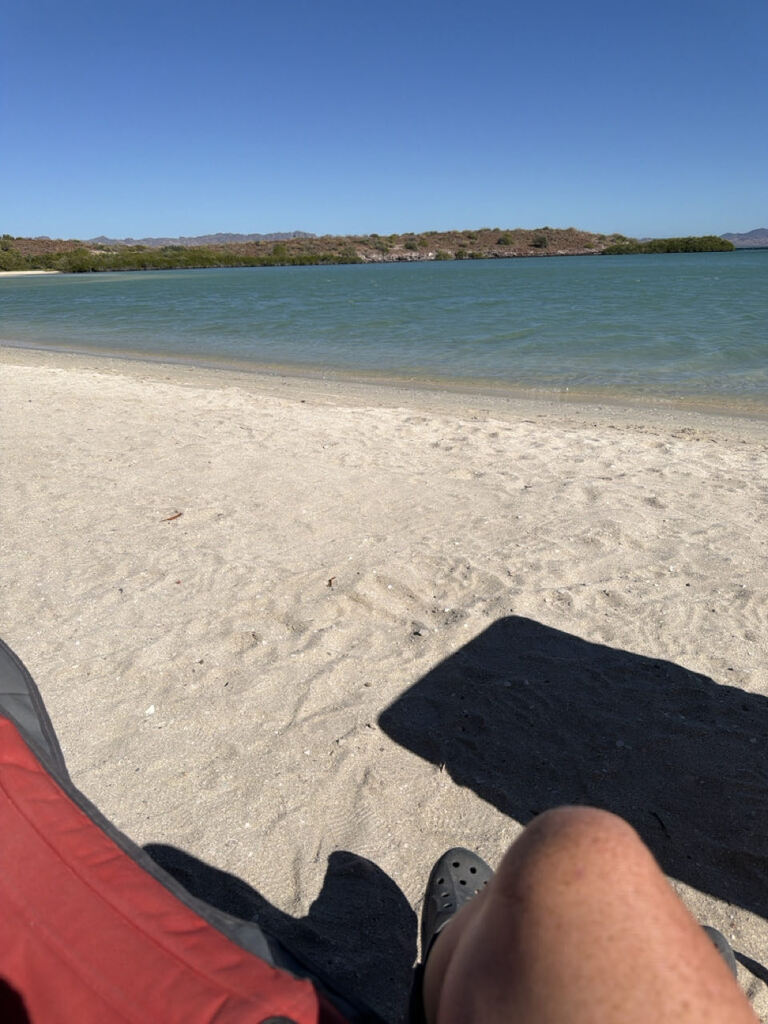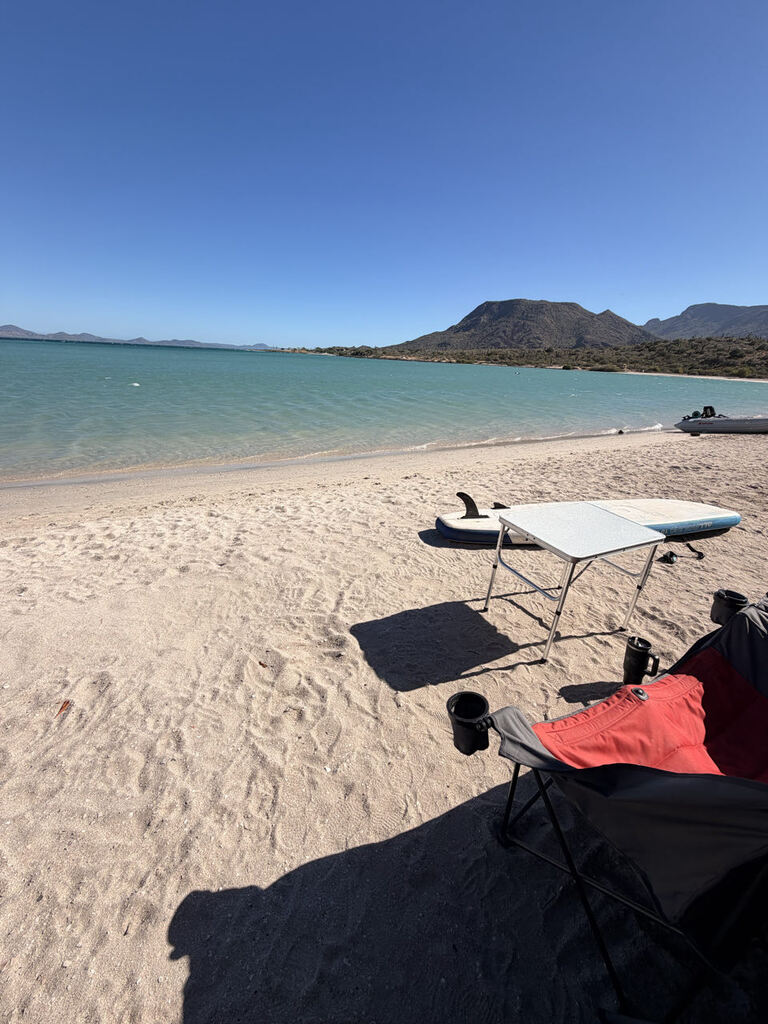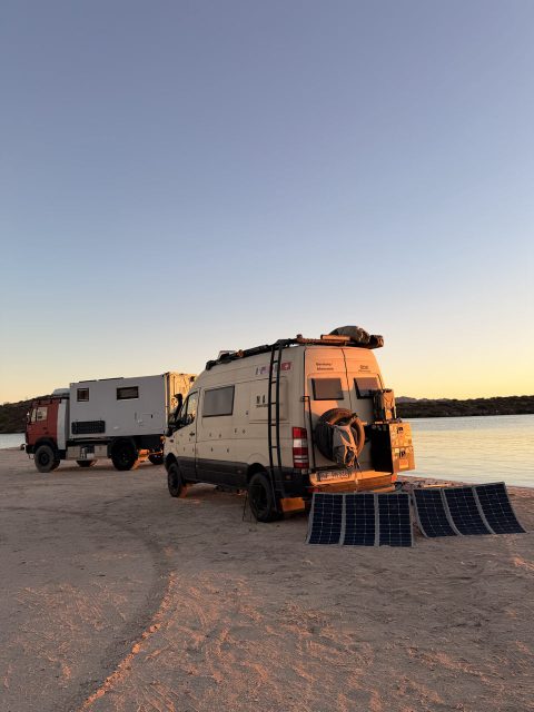 Ein (vorerst) letztes Bild heute morgen, mit Nachbar Torsten (dem Schmied). Er ist heute Richtung Loreto gefahren. Da wollen wir auch noch irgendwann hin, fahren aber morgen mit einem Zwischenstopp nach La Paz, so dass wir wahrscheinlich Mittwoch da sind. 1-2 Stunden, nachdem Torsten seinen Platz geräumt hat, sind die nächsten deutschen angekommen. Ein Ehepaar, die hier schon einige Jahre reisen, aber nur von Herbst bis ins Frühjahr. Der Sommer wird in Deutschland verbracht, das Auto bleibt in Mexiko stehen, soll wohl aber demnächst ersetzt werden. Da sie auch schon in Mittelamerika waren, erhoffen wir den ein oder anderen Tipp nachher. Mal schauen. Erstmal muss Thomas wieder auf die Beine kommen. Der liegt heute mit Magenschmerzen im Bett. Hatte schon seit ner Woche immer mal wieder Probleme und seit heute Nacht ist es wohl schlimmer geworden. Mal sehen ob Fastenkur heute und ein Tag im Bett ihn wieder fitter machen. Ansonsten laufen hier nach wie vor die Strandverkäufer rum. Fragen freundlich, ob man was braucht. Neben Garnelen, Muscheln und Fisch, werden auch Webteppiche und bestickte Shirts verkauft, manchmal auch ne Flasche „Schluck“,, keine Ahnung was da drin ist. Heute kam ein kanadisches älteres Pärchen an und verkauft Bacon, Fleisch und Salami!! Nun ja, oder zumindest das, was sie dafür halten. Ich probiere ein Stück und kaufe ne halbe. Denn bisher gibt es hier in den Supermärkten nur ne Art Formfleisch, was als Schinken verkauft wird. Ich esse da lieber Käse. Ein gelber Einheitskäse, ähnlich wie Butterkäse. Ja, der deutsche Aufschnitt fehlt tatsächlich ein wenig, aber ich möchte trotzdem nicht tauschen, wenn ich Wetter und das Meer nicht mitnehmen kann. Guckt euch nur an, bei welcher Aussicht ich hier sitze, während ich schreibe… da kann einem Aufschnitt oder deutsches Brot doch egal sein 😇😅 Bis morgen!