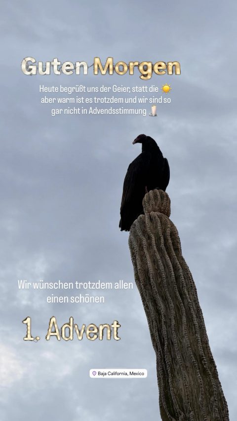 Eigentlich hatte ich mich auf einen schönen Sonnenaufgang gefreut, direkt vor mir am Meer, aber es ist so bewölkt, dass einfach nix kam 🤷♀️ Dafür setzte sich der Geier auf unsere Stellplatz eigene riesen Kaktee. Ach ja, ist ja erster Advent… halt unsere Reisekerze 😅 Zoco machte erst seine Morgenrunde und legte sich eigentlich schon wieder hin, als er plötzlich aufspringt und vor unsere Sprinter sprintet. Huch was da los? Kurzer Blick in die Richtung, ein Hund, dicker junger Labrador. Und dann ging die Lauferei und spielen richtig los 🤗. Ich greife ja selten an, aber nach gut 30 Minuten hab ich Zoco weggesperrt. Der ist so viel gerannt und brauchte dringend ne Pause. Galgos sind anfällig für die sogenannte „Galgosperre“, die Auftritt, wenn sie sich überlasten. Kein Spaß und wen es interessiert, googlet das einfach mal. Da wir heute einen „chilligen“ machen, bietet sich mal an, meine ersten Eindrücke von der Baja California zu schildern: Vorweg, als Vorbereitung für die Reise, haben wir bestimmt hunderte Videos angesehen, von Panamericana Reisenden. Mir ist kein einziger Panam Reisender bekannt, der nicht auch auf der Baja California war. Es gilt als Kult, als Traum und alle Reisenden, egal ob von Nord nach Süd oder umgekehrt, nutzen die Baja zum entspannen und in allen Videos wird diese Halbinsel regelrecht „verherrlicht“. Das hat auch in mir, extrem hohe Erwartungen geschürt. Übrigens nicht nur bei mir, auch Vossi, der ähnlich viel YouTube im Vorfeld gesehen hat, geht es so. Jetzt ist es nicht so, dass wir uns unwohl fühlen, sind hier aber auf Dinge gestoßen, die Niemand vorher mal erwähnt hat und uns gerade etwas überraschen. Da wären die Straßen. Eigentlich gibt es nur die Mex 1 und die Mex 5. Gerechnet hatte ich damit, die Insel umrunden zu können und zwischendurch mal Zickzack durchs Landesinnere. Weit gefehlt. Es gibt riesige (Küsten)Abschnitte, die gar nicht, bzw, schlecht erschlossen sind. Wo maximal kleine holprige Feldwege langgehen, die man mit maximal 15 Km/h befahren kann. Unseren Platz erreicht man auch nur nach 10 Kilometer Schotterstraße, die sogar am Anfang zum nächst größeren Dorf ausgeschildert ist ➡️ 127 Kilometer. Ihr könnt jetzt alle selbst ausrechnen, wie lange wir dafür bräuchten 🙈 kommt also, erst recht mit unserem Radlager, nicht in Frage. Dann einkaufen, Supermärkte sind hier eher kleine Emma Läden, gar nicht schlimm, mag ich sehr. Allerdings gibt es meistens einfach keine Preisschilder. Das finde ich schwierig, zumindest bei einigen Artikeln. Grundsätzlich ist es eh deutlich teurer, als wir im Vorfeld dachten. Es gibt wenige einheimische Produkte, die vielleicht etwas günstiger sind, aber insgesamt liegen die Kosten ähnlich wie in den USA. Was im Umkehrschluss aber auch heißt, essen gehen lohnt sich. Bei zwei Gerichten inkl. einem Getränk, liegt man so bei 600 Pesos, also rund 30 €. Kommt man an einem Bäcker vorbei, kann man mit einem einfachen Käsebaguette (weißer mexikanischer Käse innen, außen Brioche artig) und nen Muffin gut satt werden. Kostenpunkt 60 Pesos, also 3 Euro pro Person. Die Campingplätze bieten wenig, sind dafür oft sehr teuer. Zum Vergleich, in den USA haben wir 20-40 Dollar bezahlt. Im Schnitt eher 25. Dafür gibt es dann auch vernünftige Toiletten und heiße Duschen. Hier wurden zwischen 35-45 Dollar ausgerufen, mit verschmutzen Toiletten, kalten Duschen oder beides nicht mal vorhanden, zumindest rund um San Felipe. Wir haben in La Poma 20 Dollar bezahlt, für saubere Toiletten und wenn man Glück hatte, gab es auch ne warme Dusche. Der letzte Platz in Bahía de los Ángeles, war ein bisschen teurer, dafür total verdreckt, und über die sanitären Anlagen sprechen wir nicht. Die Strände hier sind wirklich schön, allerdings auch sehr steinig und die Bilder die wir bisher gesehen hatten auf YouTube, waren Karibik artige Buchten. Gut, wir sind noch im Norden der Baja. Der große Hype findet allerdings im Süden der Halbinsel statt. Lassen wir uns also überraschen, was da auf uns wartet. Grundsätzlich geht es uns hier traumhaft gut, das muss auch gesagt werden. Ach ja, eines noch, wer mit der Außenwelt verbunden bleiben möchte, benötigt definitiv Starlink! Telefon, geschweige Internet, ist auf unserer bisherigen Strecke, fast ausschließlich in Ortschaften vorhanden, wenn überhaupt. Auch davon hatte ich vorher nichts gehört 😅, bin aber umso glücklicher, dass wir uns schon sehr früh für Starlink entschieden haben. Apropos, wir haben zum Glück immer noch den deutschen (europäischen) Tarif, der eigentlich nur drei Monate gültig ist. Denn wir früher, als Starlink hier noch billig war, ist es nicht mehr. Hier kostet es monatlich mittlerweile 89 Euro (bei einem Durchschnittlichen Einkommen von 750,- € 🙈 und der Infrastruktur, tun mir die Mexikaner wirklich leid… Bis morgen!