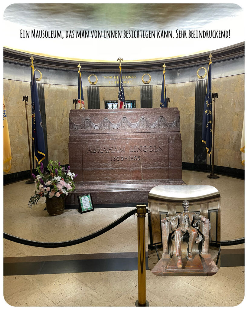 Ein bisschen Kultur, muss auch mal sein, erst Recht, wenn sie so schön in ein Städtchen eingepackt ist! Gestern Abend haben wir wieder selbst gekocht und sind uns einig, egal wie einfach das Mal ist, wir brauchen schon sehr unser gewohntes Essen. Natürlich ist die amerikanische Küche lecker, aber so schwer, dass es einem hinterher meist schlecht geht. Und wirkliche Top Restaurants, wo mit frischen Gemüse und Fisch oder Fleisch gekocht wird, sind zumindest in ländlichen Gebieten, nicht vorhanden. Fisch wird paniert, Chicken meist auch oder in Sauce ertränkt, Fleisch meist „smokey“… tja, do it yourself😅 Relativ früh ging’s ins Bett, heute wollten wir früh aufbrechen, um die kühlen Morgenstunden zu nutzen und in die Stadt zu fahren. Hier ist es zwar nicht mehr so heiß, vor allem nachts kann es richtig frisch werden, aber um Zoco im geschlossenen Auto zu lassen, ist es besser, mittags wieder zurück zu sein. Also haben wir uns ein UBER gerufen, was für ein Segen, diese Dinger, und haben uns zur Lincoln Home National Historic Site bringen lassen. Ein ganzer Straßenzug mit historischen Häusern, eines davon, wo Lincoln mit seiner Familie von 1844 – 1861 lebte. Nicht nur wirklich hübsch anzuschauen, in ein Haus konnte man auch rein und dort wurde seine Nachbarschaft, aber auch wichtige Weggefährten vorgestellt. Übrigens auch für Kinder teilweise super gemacht. In einem anderen Haus wurde Lincolns Werdegang in Springfield und auch ein paar Details von seinem Haus erklärt. 1500 Dollar hat es damals gekostet und ist dann später mit ihm „mitgewachsen“. Also wurde erweitert, nachdem seine Söhne geboren wurden. Es ist hier unmöglich, lauter Dinge über Abraham Lincoln zu schreiben, ich kann aber jedem den es interessiert, Wikipedia ans Herz legen. Wirklich super spannend sein Werdegang und was er alles erreicht hat, in seinem doch recht kurzen Leben. 56 Jahre durfte er werden, bevor er durch ein Attentat ums Leben kam. Er war somit nicht nur der erste republikanische Präsident, sondern auch der erste Präsident, der einem Attentat zum Opfer viel. Nach dem Besuch der historischen Straße, gingen wir erst Richtung Capitol und von dort zum Museum. Wir waren kurz drinnen, waren aber doch erstaunt, alles vorher war kostenlos, wirklich sehr hübsch zurecht gemacht. Selbst eine kostenlose Führung hätten wir mitmachen können, bei der man auch sein Haus von innen besichtigen konnte. Dieses Museum wollte aber Eintritt. An sich nicht verwerflich, jedoch für uns irgendwie befremdlich, da ausgerechnet das Museum eine riesen Sponsorentafel vorzuweisen hatte, wo sich diverse große Firmen verewigt haben, die das ganze finanziert haben. Wir hatten eh nicht so viel Zeit, somit fiel uns die Entscheidung leicht, weiter zu gehen. Wir wollten als nächstes zu Abraham Lincolns Grab. Dieses ist eingebettet in einen riesigen Friedhof, übrigens das erste Mal, dass wir einen Friedhof sehen, der ähnlich unserer Kultur, in einer Parkähnliche Landschaft sich befindet. Sonst finden wir die hiesigen Friedhöfe wirklich gewöhnungsbedürftig. Meist an einer viel befahrenen Straße, einfach Steinplatten auf dem Boden, gern mit Plastikblumen „geschmückt“. Zum Memorial Day allerdings auch mit tausenden US Fähnchen. Dieser Friedhof war aber wirklich schön. Sein Mausoleum beeindruckend. Seine Frau und zwei seiner Söhne, sind hier ebenfalls beerdigt. Als wir wieder rauskommen, ist es nicht mehr weit und wir laufen den Rest der Strecke zu Fuß zu unserem Stellplatz. Was ein schöner Ausflug, Zoco hat es auch gut überstanden, freut sich aber natürlich, dass wir wieder zurück sind. Jetzt haben wir uns einen entspannten Nachmittag echt verdient und so langsam gucken wir nach unserem nächsten Stellplatz in oder bei Chicago. Hab ich echt Respekt vor… ihr kennt ja meine Einstellung zu Großstädten 🙈 Also falls ihr morgen nichts von uns lest, war ich zu platt, um noch zu berichten… bis denne…